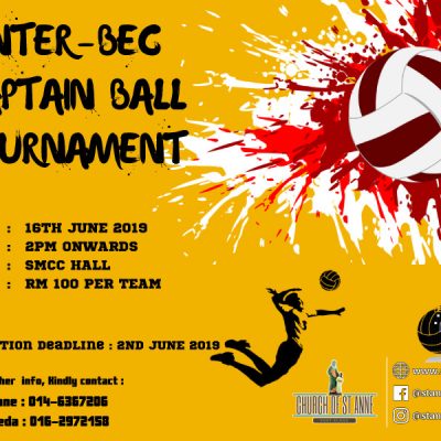 Inter BEC Captain Ball Tournament 30/06/2019 2PM Onwards SMCC HALL Date : 30 June 2019 (Postponed frm 16th June) Time :2pm onwards Fee: RM 100/- Registration Deadline: 16 June 2019 For further details kindly contact Daphene: 014 6367206 or Albreda: 016 2972158