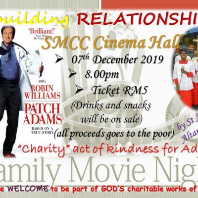 “Building RELATIONSHIP” by the St. Anne’s Altar Servers – Family Movie Night 07/12/2019 8.00PM Date: 07 December 2019 Time: 8.00pm Ticket: RM5/- Venue: SMCC Cinema Hall (Drinks and snacks will be on sale ~All proceeds goes to the poor) “Charity “ act of kindness for Advent. All are Welcome to be part of GOD’s Charitable works of mercy