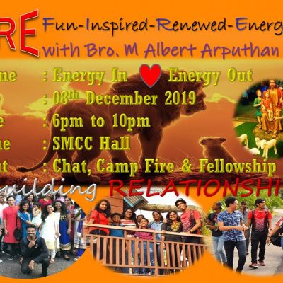 (Fun – Inspired – Renewed – Energized) with Bro.M.Albert 08/12/2019 6PM-10PM SMCC Hall “FIRE” Theme: “Energy In = Energy Out” Date: Sunday 08 December 2019 Time: 6.00pm – 10.00pm Venue: SMCC HALL Event : Chat, Camp Fire & Fellowship Purpose: Building ‘RELATIONSHIP’ (Invitation for the ‘Youth’)